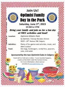 Join us for the “2023 Optimist Family Day in the Park” on Saturday, June 3rd from 10 AM to 3 PM at Optimist Athletic Park in the Glenbrook Community of southwest Calgary.