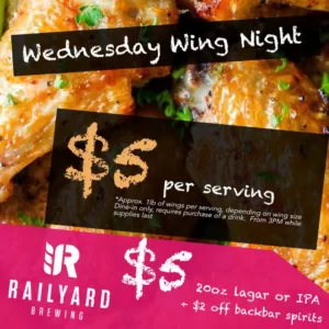 Wednesday Night Specials: $5.00 beer (20 oz), $5.00 wings (1 lb.), $2.00 off spirits. See picture below